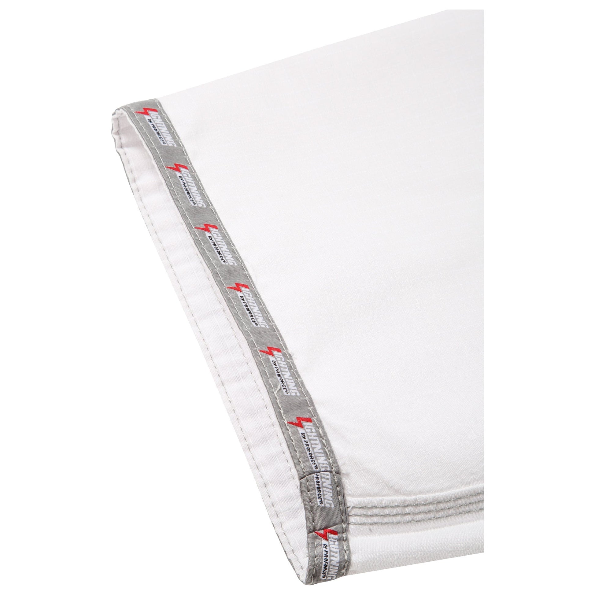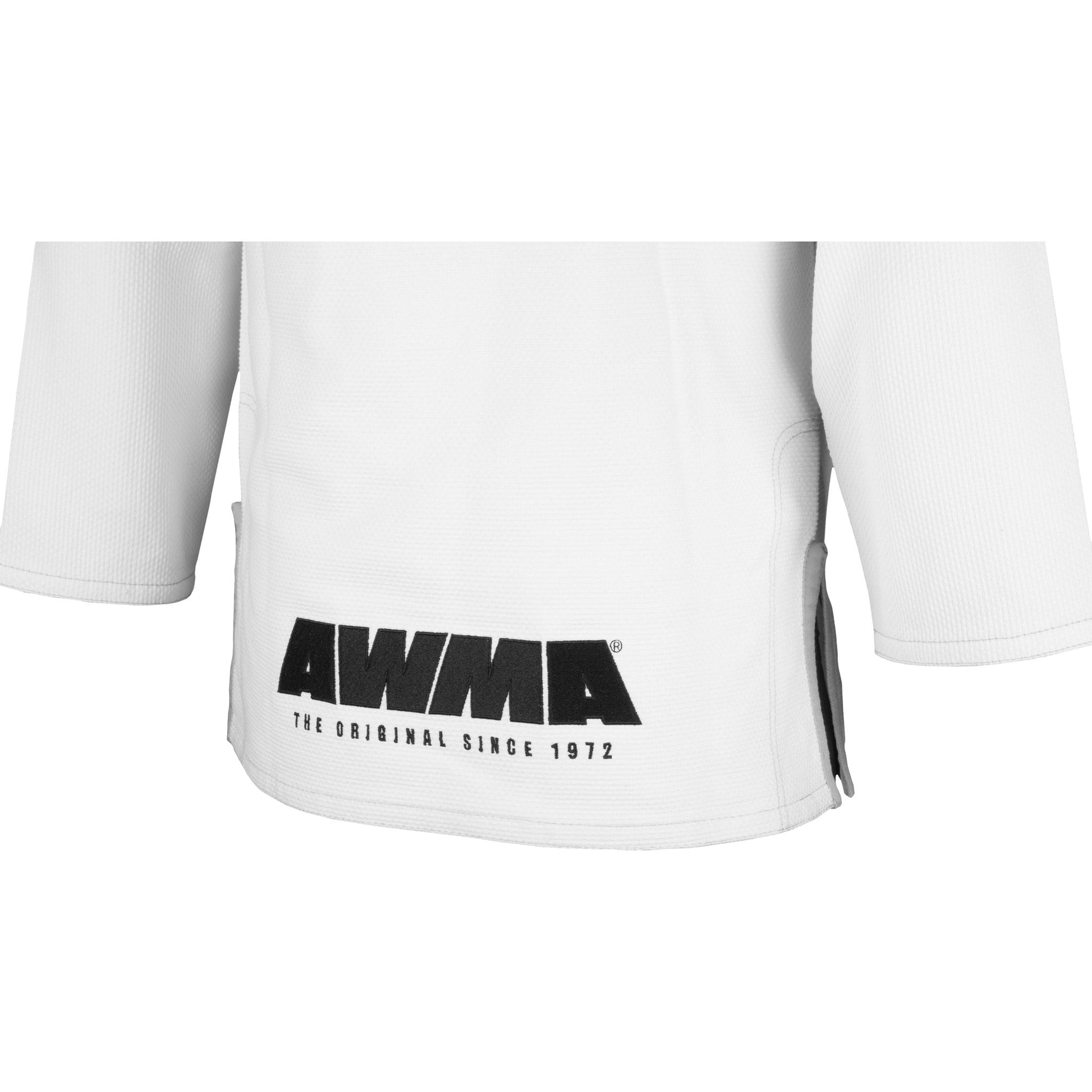 Stress areas are triple reinforced for durability and the Pearl weave 450 grams 100% cotton jacket with 10-oz rip stop cotton pants featuring a soft high density rubber bungee draw cord waistband for a sure clamping closure and was designed for competition signature performances.