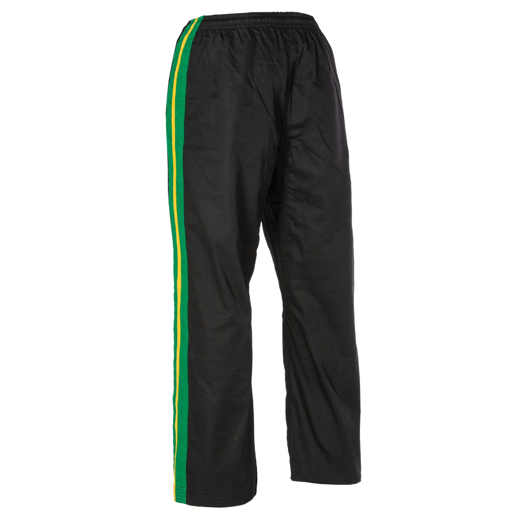 These 8 oz. medium weight karate pants with side pockets are made of a 55% cotton / 45% polyester blend and feature an elastic drawstring waist. Available in Black with Green and Yellow Stripes down the side, and 4 sizes.