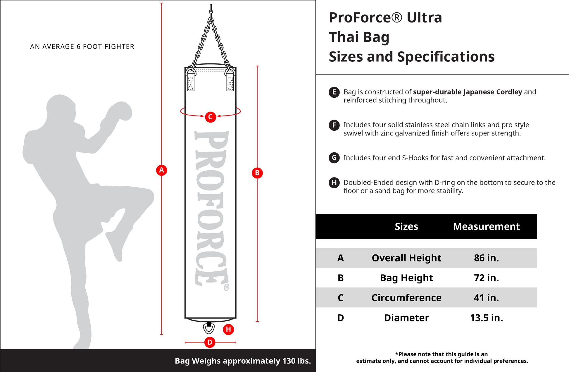 Constructed of super durable Japanese Cordley. Reinforced stitching throughout. Includes four solid stainless steel chain links and pro style swivel with zinc galvanized finish. Includes four s hooks for fast and convenient attachment. Double ended design with D-ring on the bottom to secure to the floor or a sand bag for more stability.