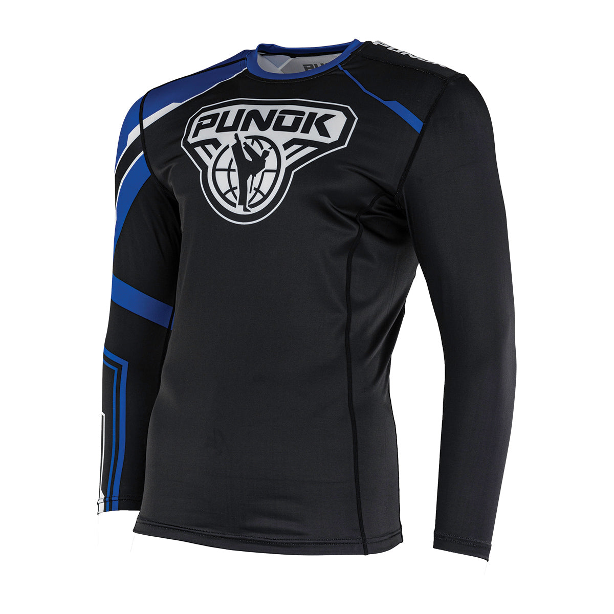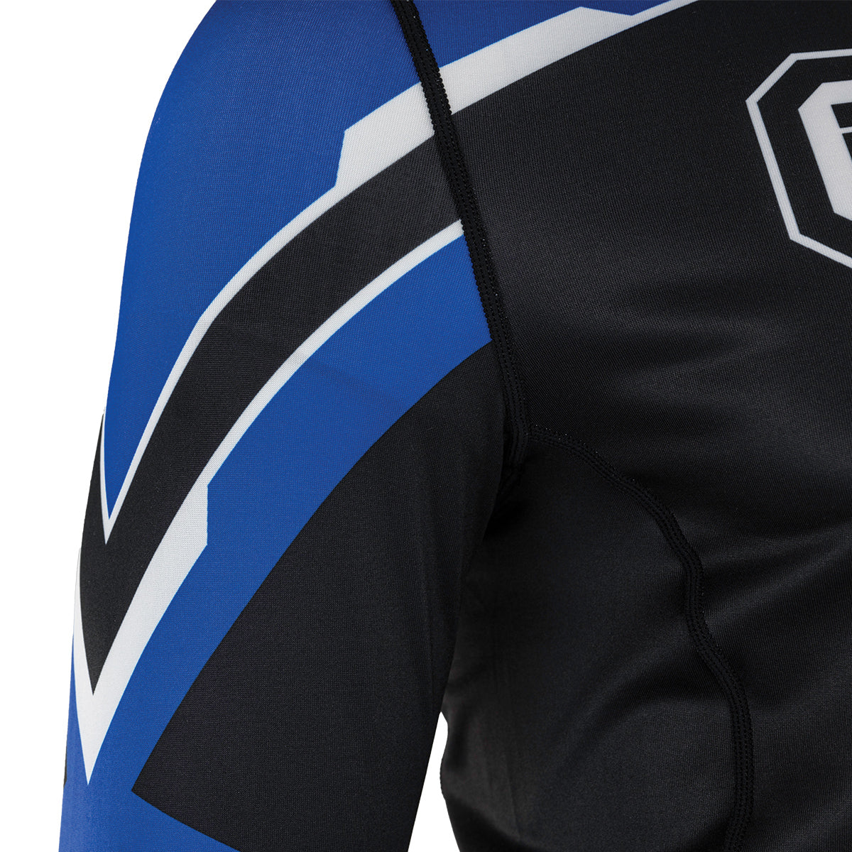 Train like a world champion with this dynamic long sleeve compression rash guard. Perfect for training at the dojo or during your physical conditioning sessions. This modern superhero look will allow you to train and feel at your peak. This item comes in black color with one blue sleeve and white elements.