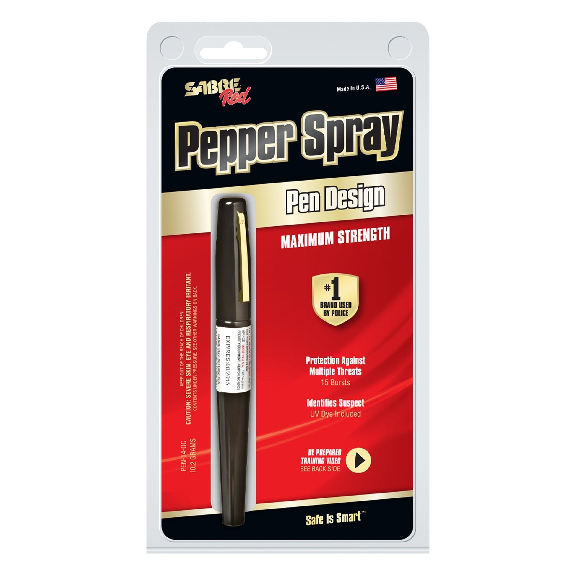 Suprise your attacker with this handy self defense pen loaded with Super Tear Gas and Red Pepper Spray. Remove cap to fire. Easy to conceal in a pocket or purse. Looks like a real pen. Practical, positive protection. Sabre contains a unique formula of CS Military Tear Gas, Red Pepper, and an ultra violet dye for suspect identification. CS Military Tear Gas is an irritant which causes a severe burning sensation in the eyes, tearing, coughing and difficulty in breathing. CS Military Tear Gas is so effective that it was chosen in 1959, and still is today, the number one riot control agent of the US> Armed Forces! Sabre's CS Tear Gas and Red Pepper concentration is the strongest allowed by law.This item cannot be shipped to the following states: AK, CA, HI, IL, MA, NV, NY, WI, DC.