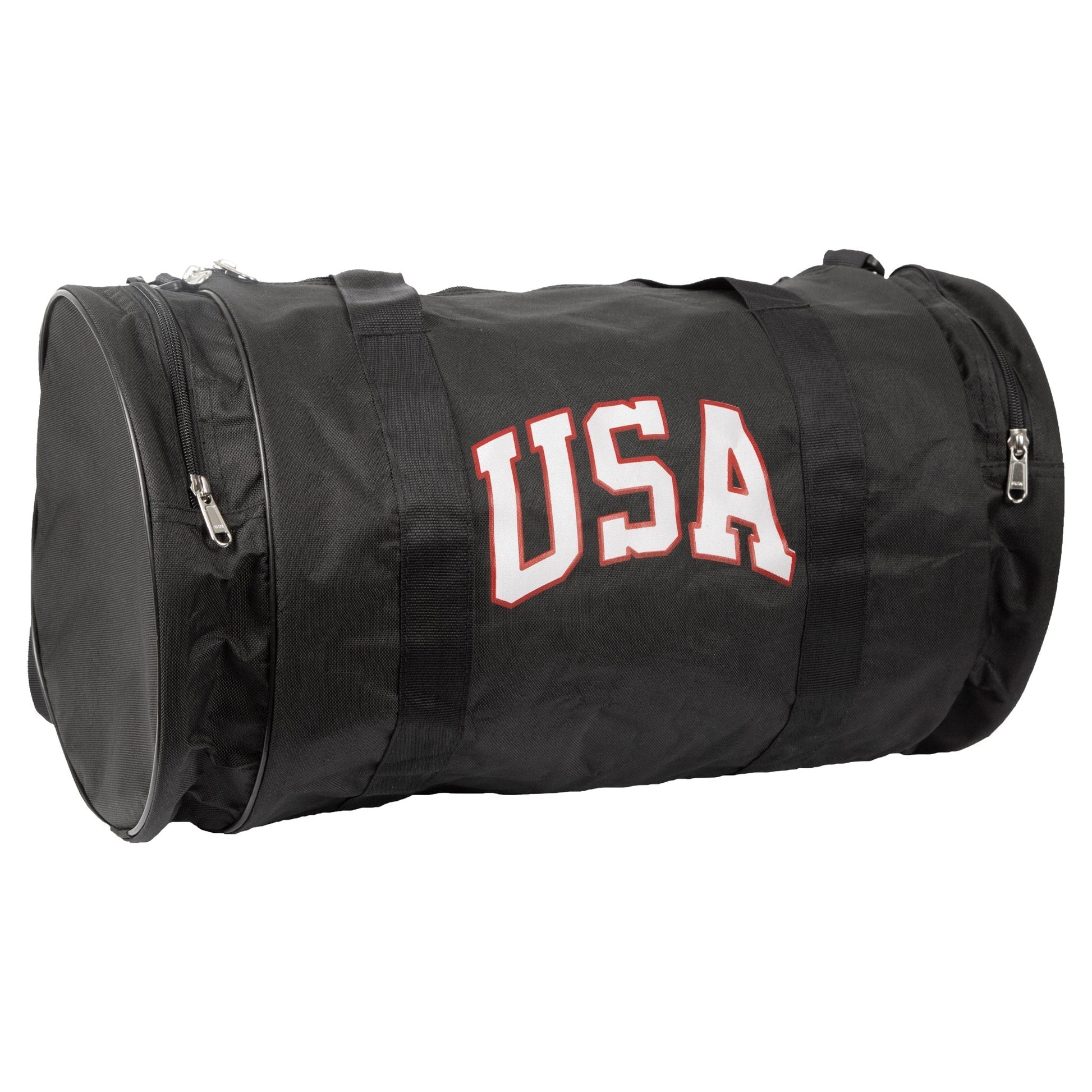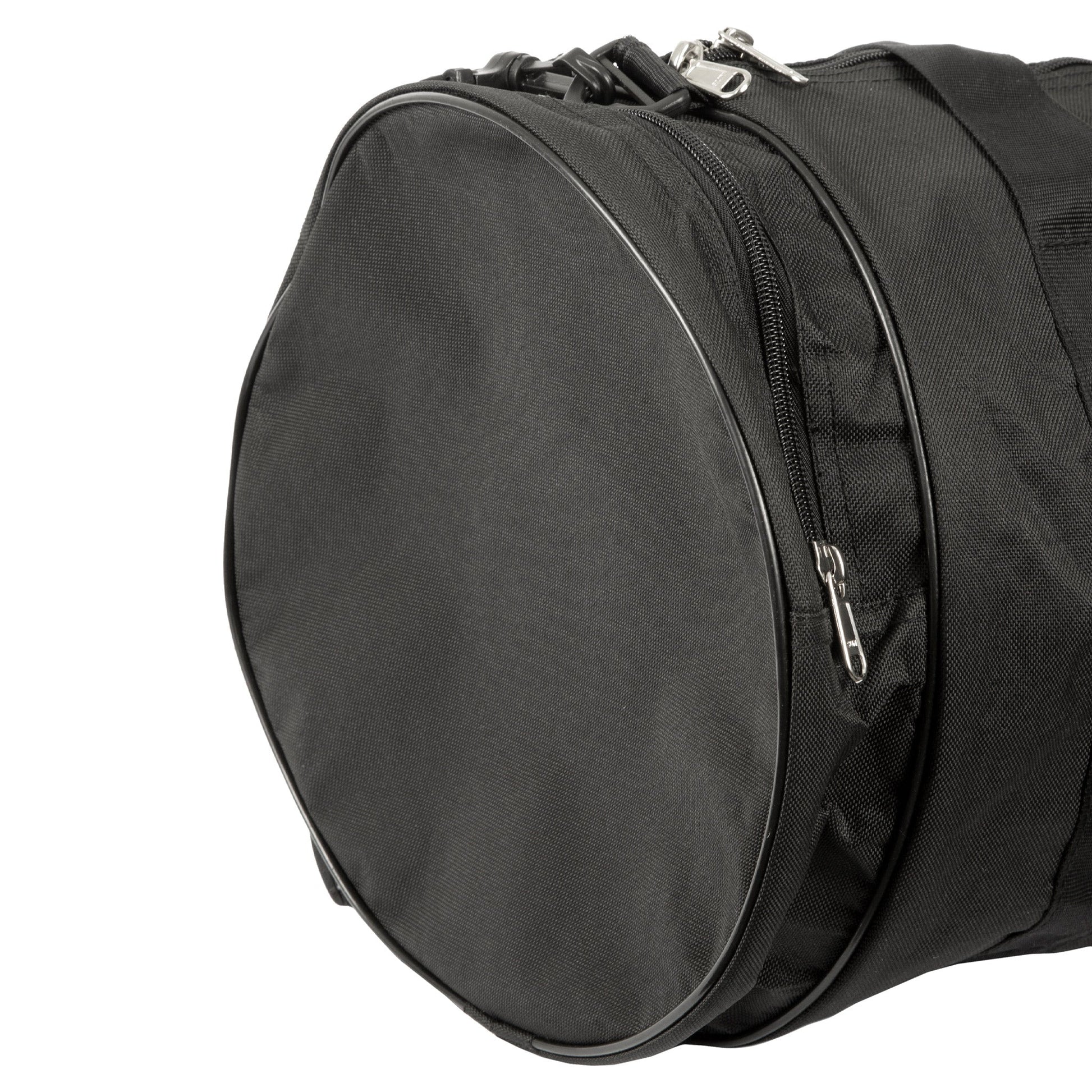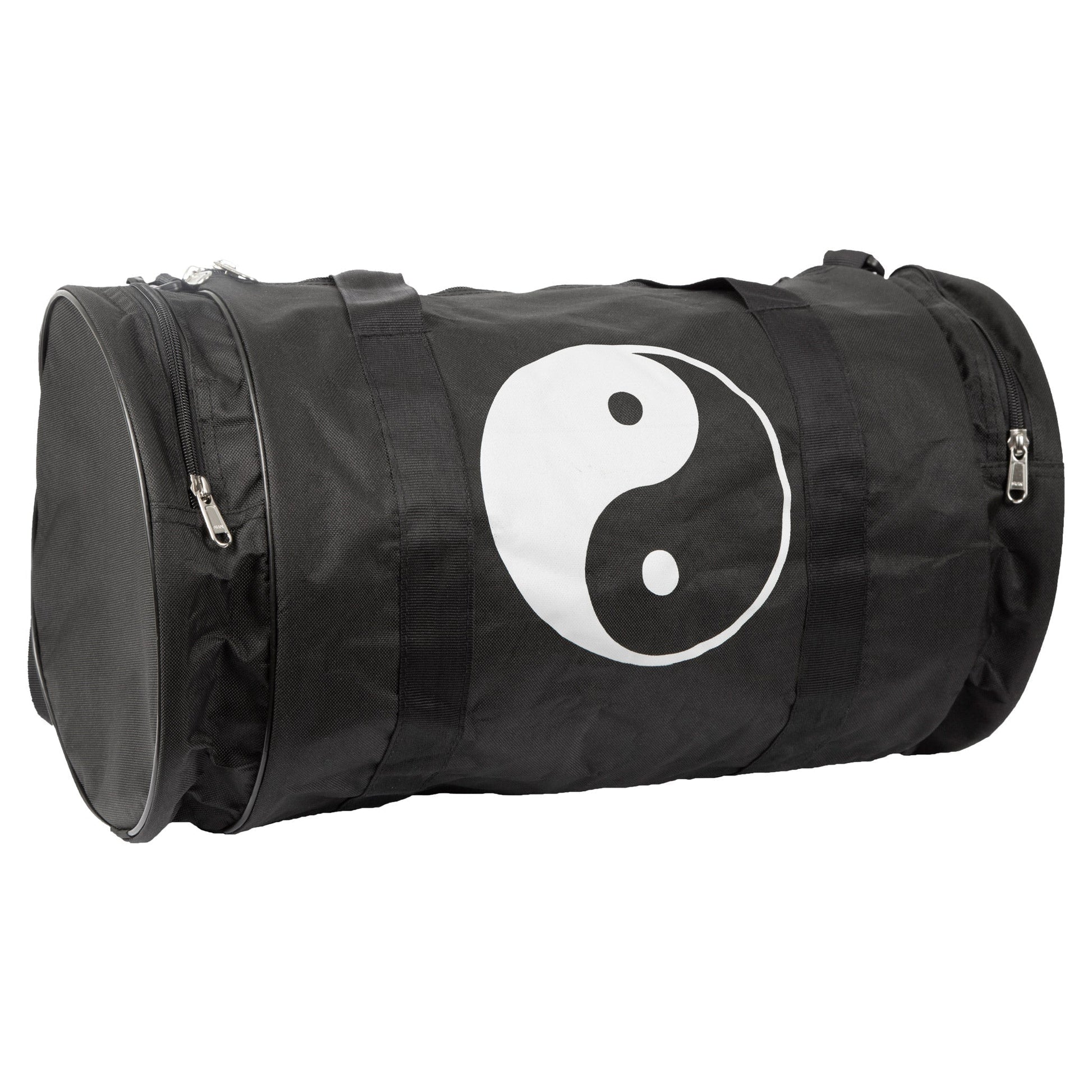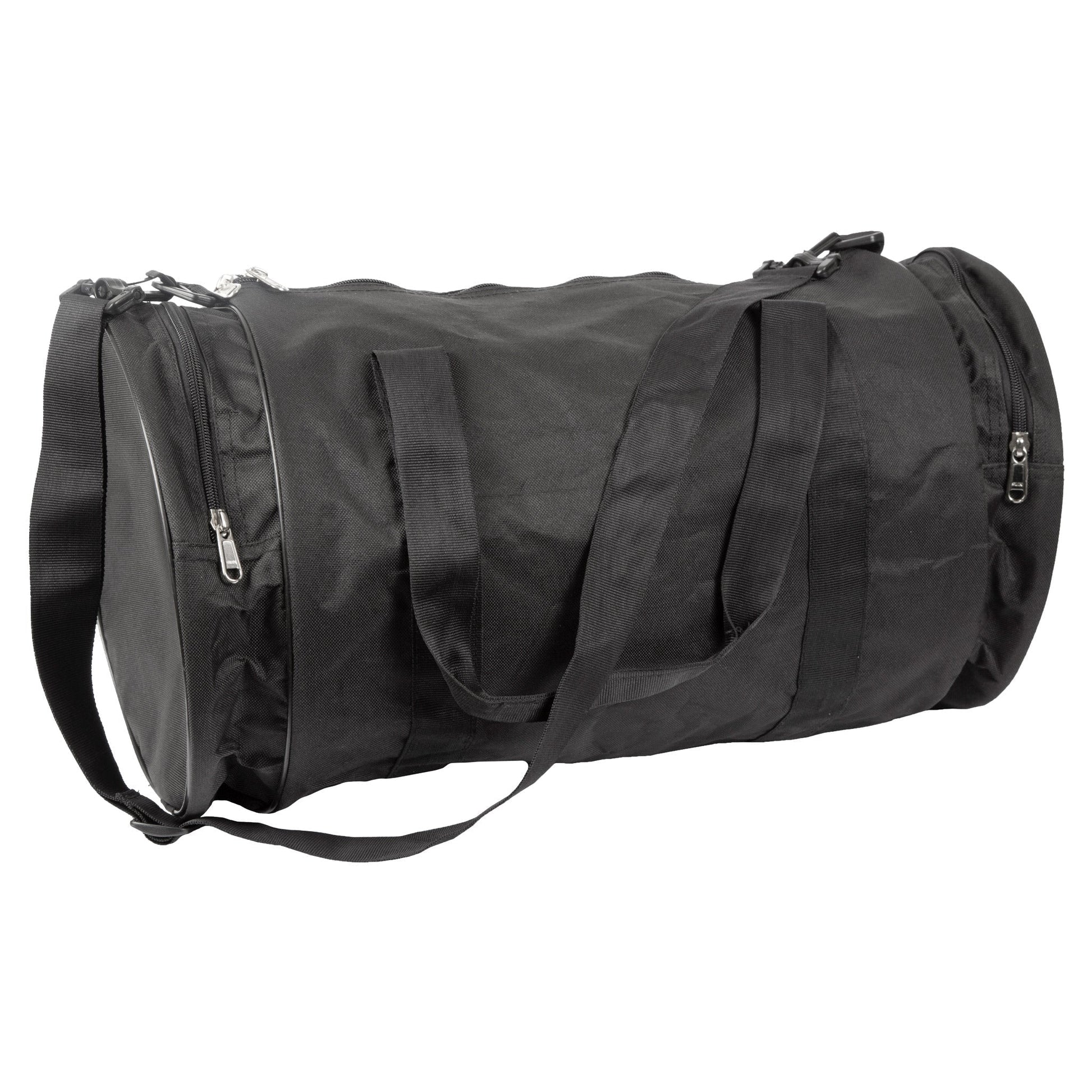 This 22'' x 11'' bag is constructed with reinforced nylon abraison resistant fabric. Features a zippered closure, two handles, and adjustable shoulder straps. Both ends feature stoarge pockets with zippers and end panels are either solid black or screen printed with one of 4 designs.