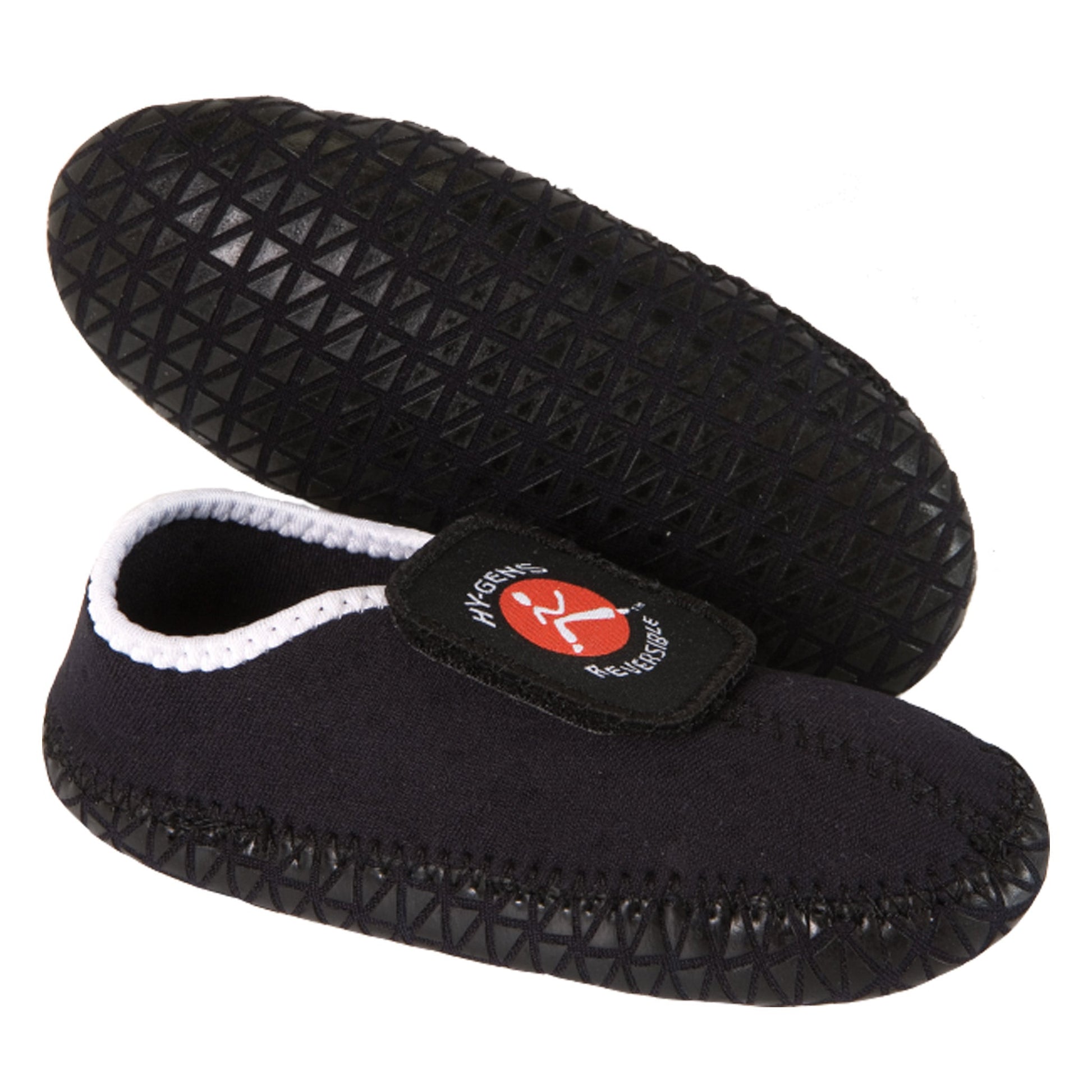 This machine washable shoe has velcro tabs that help it form fit to your foot like a glove for protection. The fabric is a thicker neoprene with Ultra Channeling Ventilation (UCV), which helps protect your and your students’ feet from skin conditions and odor problems. Even though the fabric is a thicker neoprene, it is still thin enough that they can be worn with sparring gear or in place of socks. This shoe is the only martial arts shoe that is reversible and can be worn on the floor. The non-slip, non-grip thicker sole allows for easy movement while training. We feel student enrollment will increase by eliminating the problems associated with bare foot training. Please note: Not responsible for rips or tears due to outdoor use. Hy-Gens™ is strictly an indoor shoe.